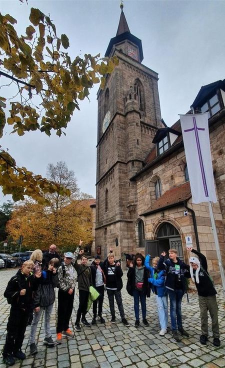 Am Dienstag, 08.10.2024 fuhren wir zusammen mit der 5Ga mit dem Zug nach Fürth. Zuerst liefen wir zur Kirche St. Michael, deswegen heißt die Kärwa nämlich „Michaeliskärwa“. Ein freundlicher Mann, Herr Palm, begrüßte uns und erklärte einiges. Dann stiegen wir gemeinsam auf den Turm der Kirche. Es war sehr eng und anstrengend, aber oben hatte man eine supertolle Aussicht! Wir sahen ganz Fürth, das Stadion und sogar die Nürnberger Burg. Wir warteten, bis die großen Glocken geschlagen hatten, damit keiner erschrickt, bevor wir wieder nach unten gingen.