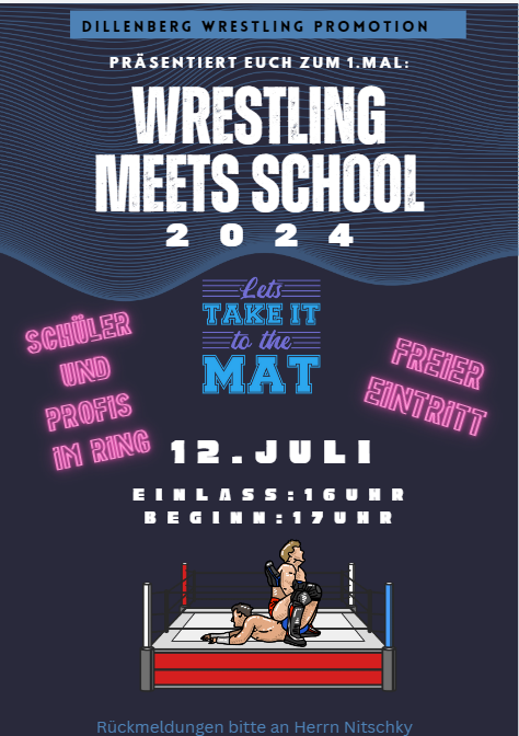 Im Juli 2024 war es endlich soweit – das 1. Wrestling-Event an der Dillenberg-Schule. Ein offizieller Wrestling-Ring wurde in der Aula der Dillenberg-Schule aufgebaut. Unter dem begeisterten Jubel von Mitschülern, Lehrkräften und Eltern traten SchülerInnen der Wrestling AG beim abendlichen Event gegen Größen der Wrestling-Szene an und begeisterten das Publikum mit einer mitreisenden Show. Am Ende waren sich alle einig – ein rundum gelungener und mitreisender Abend mit hohem Unterhaltungsfaktor.